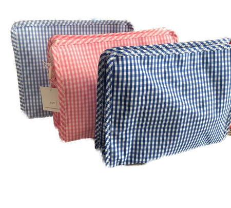 The gingham travel bag will be your go to for travel, gym or your purse. The interior and exterior of the bag are wipeable, making it easy to clean, bonus!